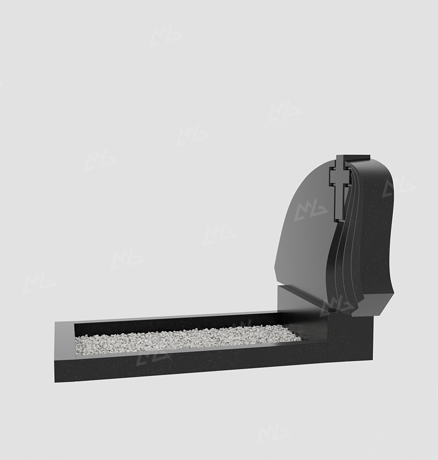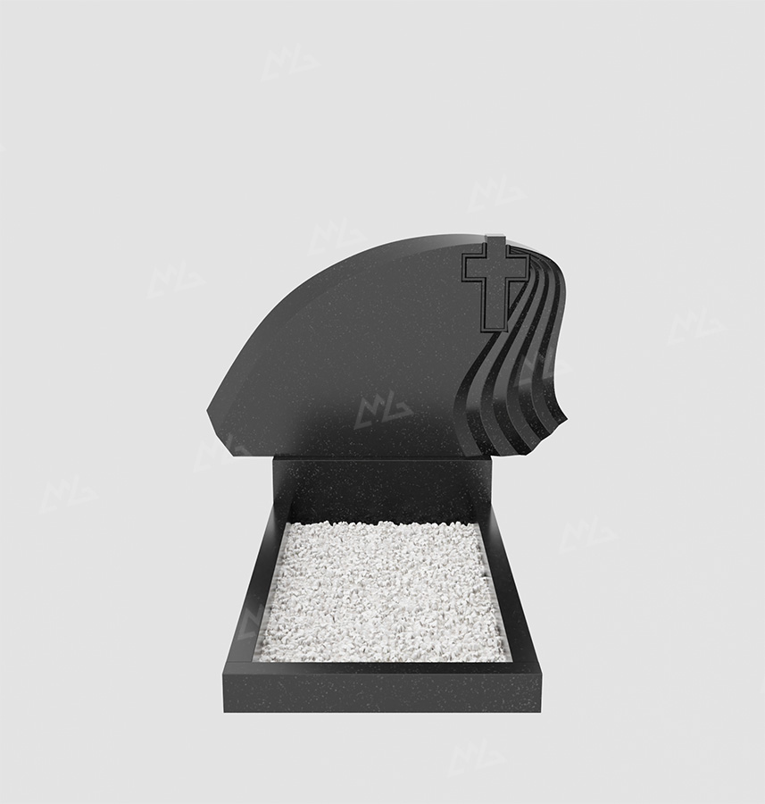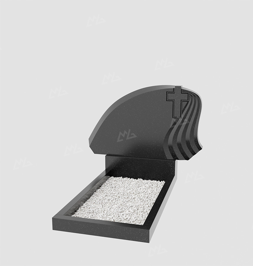 Горизонтальный гранитный памятник в форме волны, с крестом и волнистыми выемками. Цена указана за изделие стандартной комплектации (стела+постамент+цветник) с учетом полировки. Возможно изменение размеров под заказ или изготовление из других пород камня. В стоимость не входит оформление и установка.